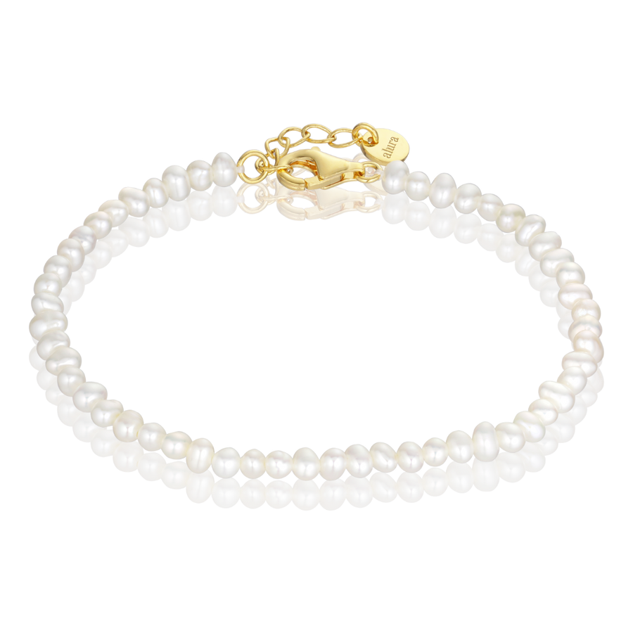Das Armband besteht aus einer feinen Kette aus vergoldetem Sterlingsilber, an der kleine Süßwasserperlen für einen leichten und harmonischen Ausdruck rund um das Handgelenk sorgen. Der natürliche Glanz der Perlen verleiht dem Schmuck einen klassischen und raffinierten Look, der sowohl für den Alltag als auch für Partys perfekt ist.