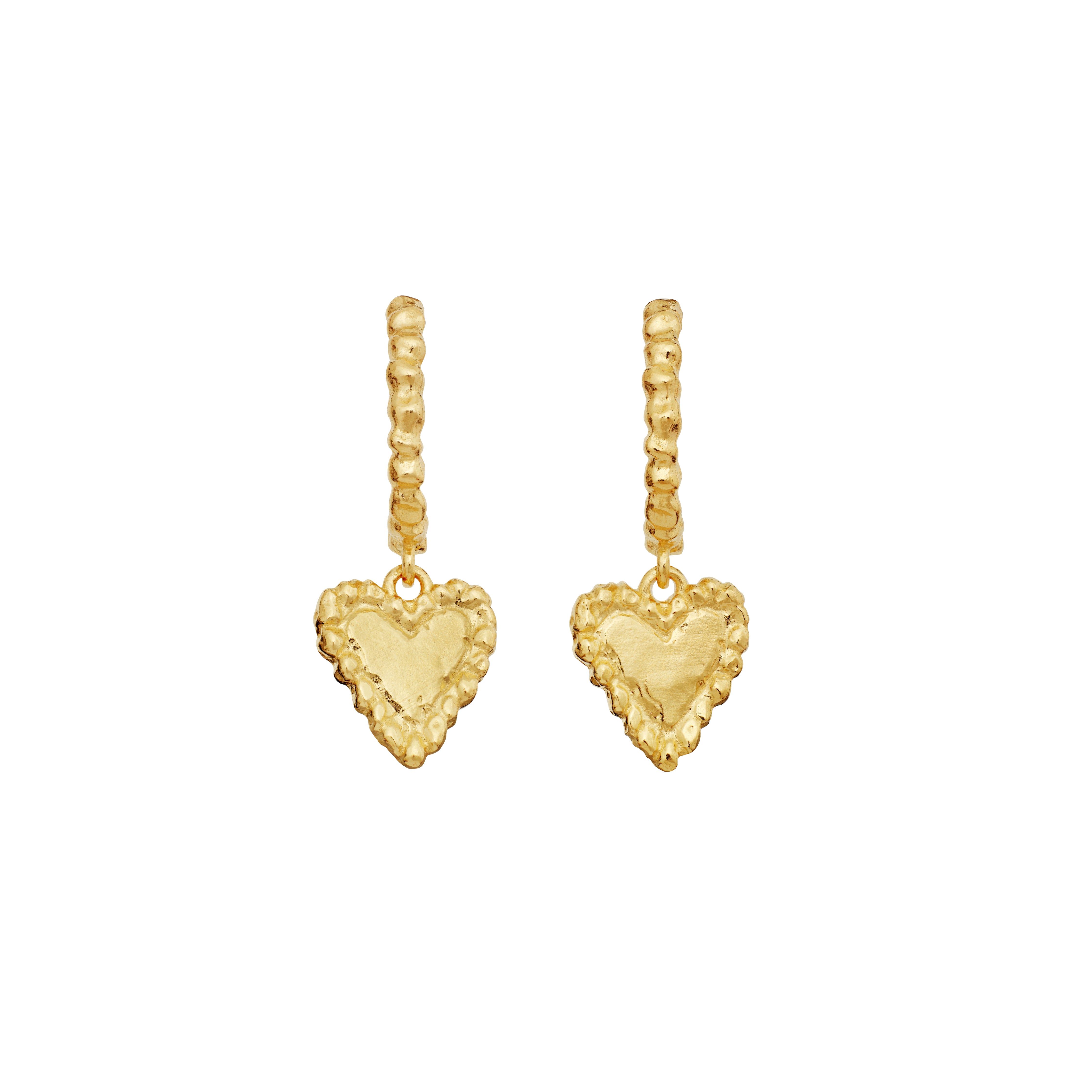 Die Rosalinde-Ohrringe von Maanesten umarmen Sie mit einem romantischen und sanften Ausdruck. Die feinen, umschlossenen Herzen hängen elegant unter einer goldenen Creole, was dem Stück eine schöne Bewegung und einen femininen, warmen Glanz verleiht. Ein Paar Ohrringe, die sowohl persönlich als auch zeitlos wirken.