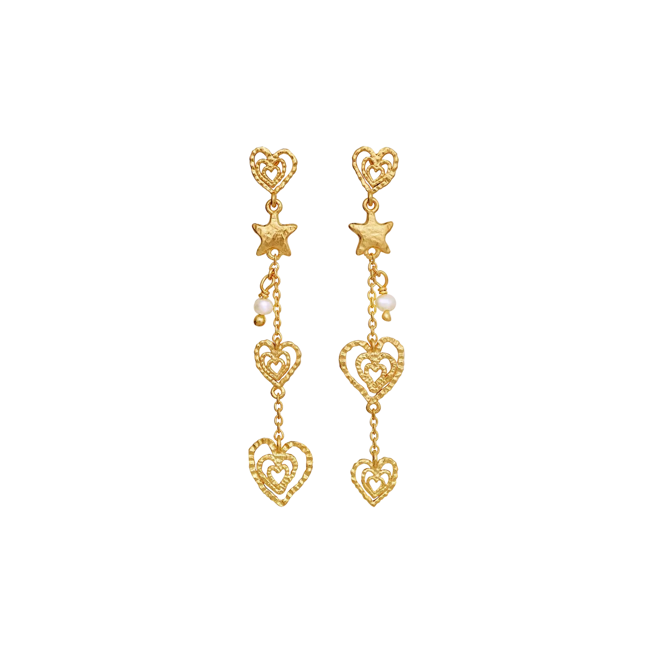 Maanesten Irena Ohrringe vereinen Frieden, Liebe und Harmonie in einem poetischen Design. Kleine Herzen und ruhige Sterne fallen locker entlang der Kette und sorgen für einen femininen und ausgewogenen Ausdruck – als stille Erinnerung an die Schönheit in den kleinen Details.