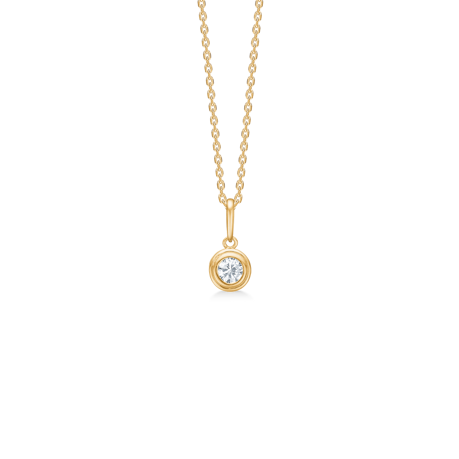 Im Zentrum befindet sich ein klarer, rund facettierter Zirkonia, eng umschlossen von einer Zargenfassung. Der strukturierte Kranz um den Stein erzeugt Tiefe und betont das klare Licht, während die spiegelglänzende Goldoberfläche die Umgebung elegant reflektiert. Das Ergebnis ist ein Anhänger mit einem präzisen und fokussierten Ausdruck – feminin, raffiniert und sowohl im Alltag als auch in besonderen Momenten leicht zu tragen.