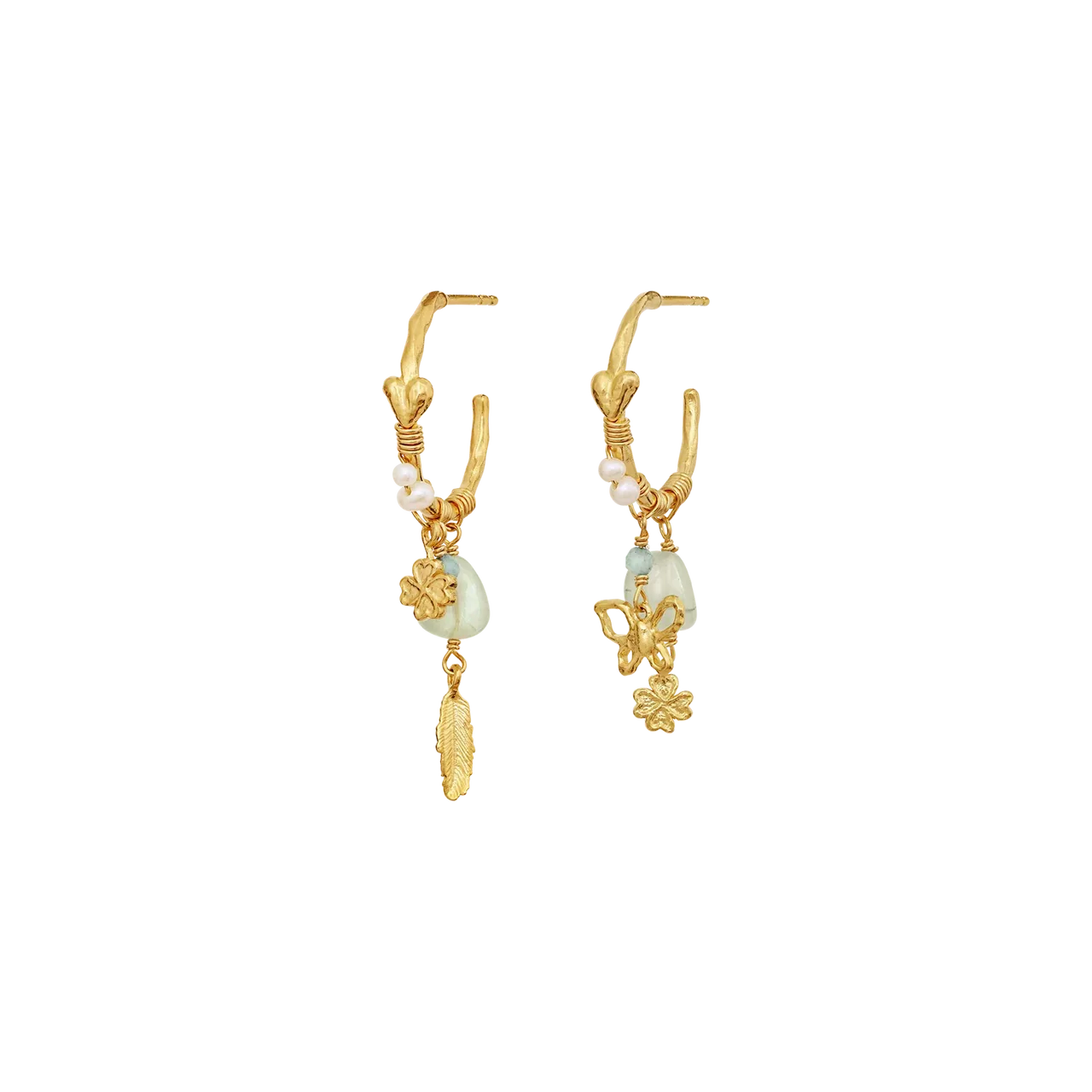 Maanesten Arden Ohrringe blühen wie eine märchenhafte Sommerwiese. Die feinen Anhänger mit Federn, vierblättrigen Kleeblättern und Schmetterlingen bewegen sich leicht und erzeugen einen lebendigen, femininen Ausdruck voller Symbolik und sommerlicher Atmosphäre. Die Ohrringe wecken Erinnerungen an sonnige Tage und das magische Gefühl der Freiheit, das nur der Sommer vermitteln kann.