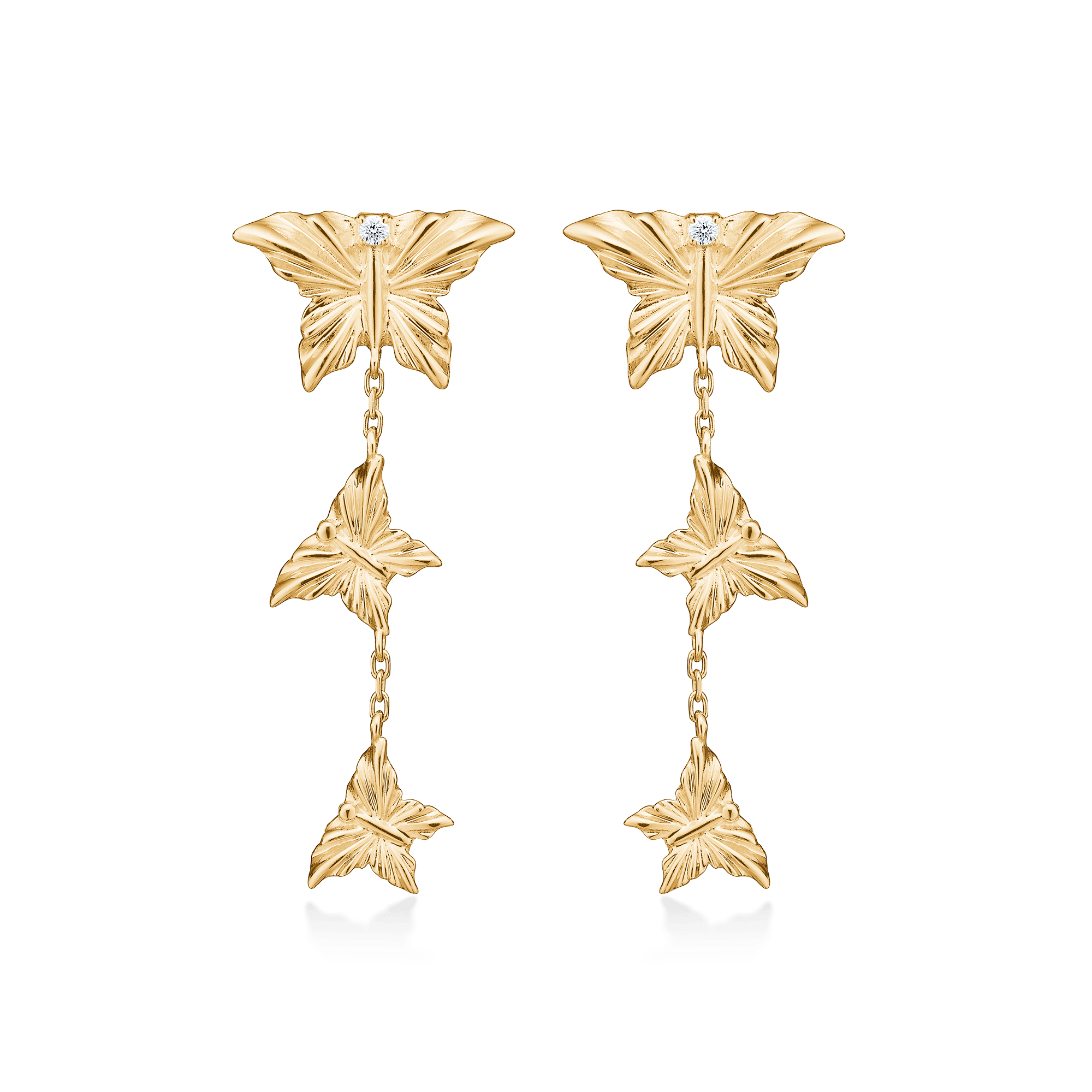 Die MONARCH-Ohrringe sind vom anmutigen Monarchfalter inspiriert, einem Symbol für Transformation und Freiheit. Sie sind aus 14 Karat Gold gefertigt und mit 0,024 ct besetzt. Brillanten W.SI. Die Ohrringe haben ein wunderschönes Design mit feinen schmetterlingsförmigen Anhängern, die elegant an einer Kette hängen. Der Monarch-Schmuck erinnert an die innere Stärke und Schönheit, die jede Frau besitzt, und symbolisiert die Stärke, die sie zur Herrscherin ihres eigenen Lebens macht.