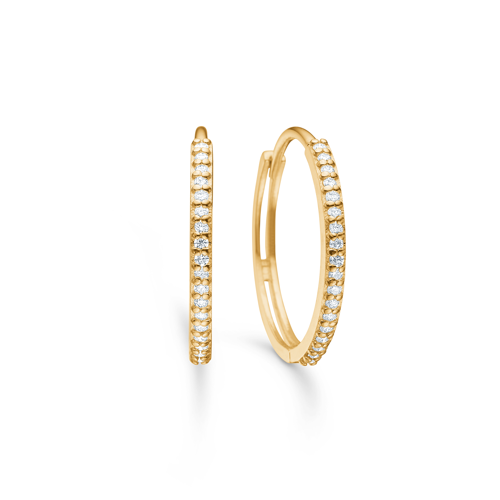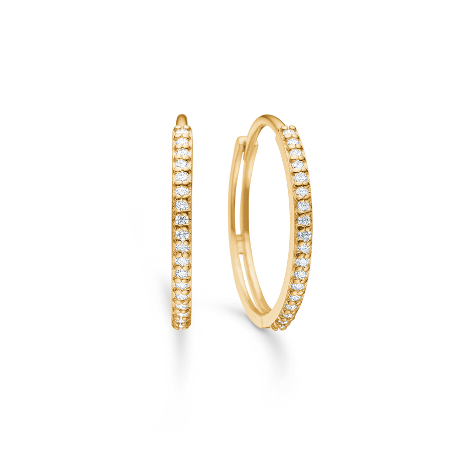 Der integrierte Verschluss mit verstecktem Scharnier schließt den Kreis und sorgt für einen bequemen und sicheren Sitz. Mit einem Durchmesser von 18 mm haben die Ohrringe eine sichtbare, aber dennoch elegante Größe. Tragen Sie sie einzeln als Statement im Alltag oder kombinieren Sie sie für besondere Anlässe mit einer einfachen Goldkette oder einem Diamantanhänger. Eine offensichtliche Geschenkidee für alle, die sich klassische Diamantohrringe aus echtem Gold wünschen. Die Lumina-Ohrringe sind Teil der Mads Z Gold Label-Kollektion.