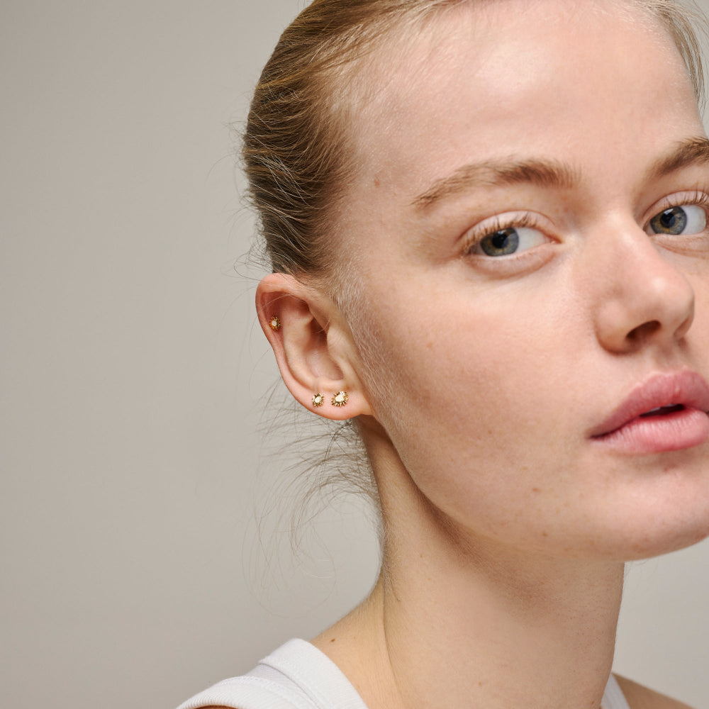 Kleine, feine Ohrringe mit einem ruhigen und natürlichen beigefarbenen Zentrum. Perfekt für alle, die einen dezenten und harmonischen Look lieben. Das Design ähnelt einer Sonne oder Sonnenblume und fügt Ihrem Schmuckmix ein schönes Detail hinzu. Erhältlich in mehreren Farben.