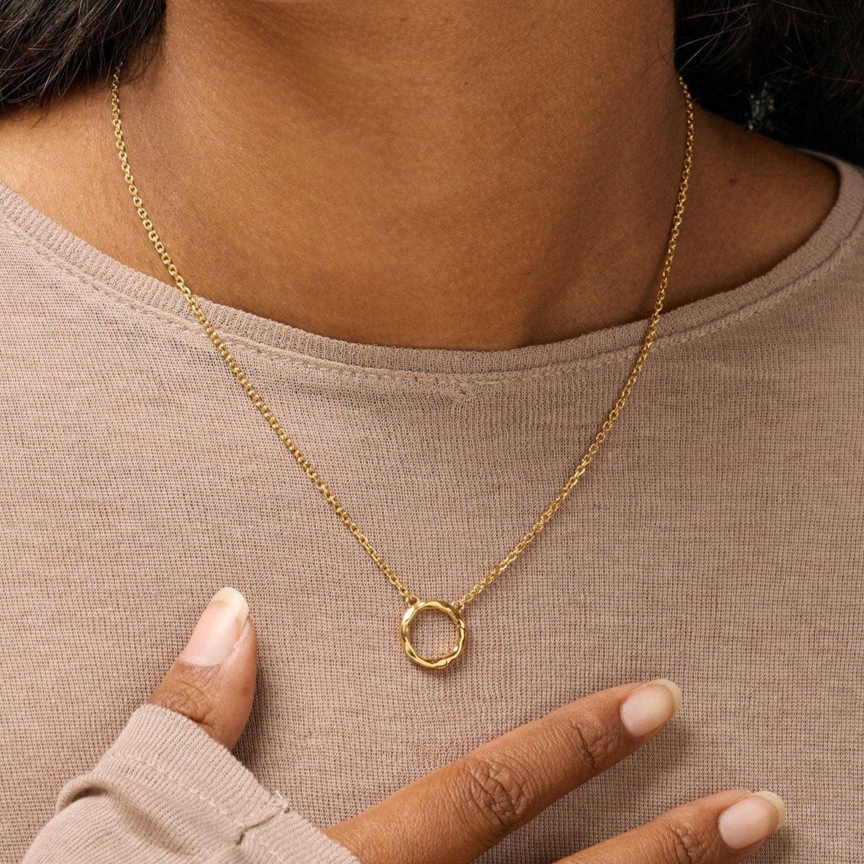 Die Treasure-Halskette von ENAMEL Copenhagen ist sowohl elegant als auch funktional und ermöglicht es Ihnen, Ihre wichtigsten Anhänger nah bei sich zu tragen. Die Halskette ist wunderschön aus 18 Karat vergoldetem, recyceltem 925er Sterlingsilber mit mattem Finish gefertigt. Das einzigartige Design ermöglicht es, den Kreis zu öffnen und einen persönlichen Anhänger, einen bedeutungsvollen Ring oder einen anderen geschätzten Gegenstand hinzuzufügen, den Sie bei sich tragen möchten. Mit einer verstellbaren Länge von 42 cm plus 3 cm extra lässt sich die Halskette an die gewünschte Passform anpassen.