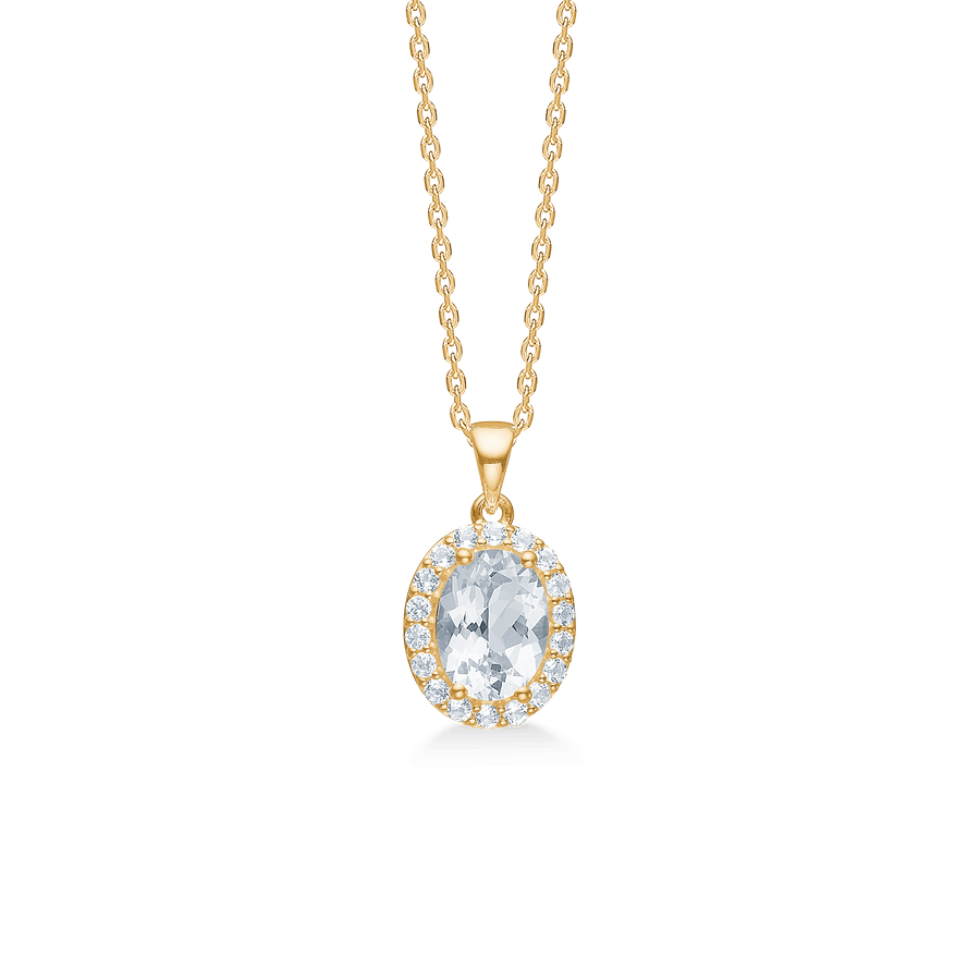 Der Anhänger ist aus 8 Karat Gold gefertigt und mit auffälligen facettierten weißen Topasen verziert, umgeben von funkelnden weißen Zirkonia. Durch die Kombination dieser Elemente entsteht ein schöner Kontrast und ein Design, das sowohl auffällig als auch elegant ist. Himmlisch von Medina ist eine zeitlose Begegnung zwischen Eleganz und Medinas persönlichem Ausdruck.