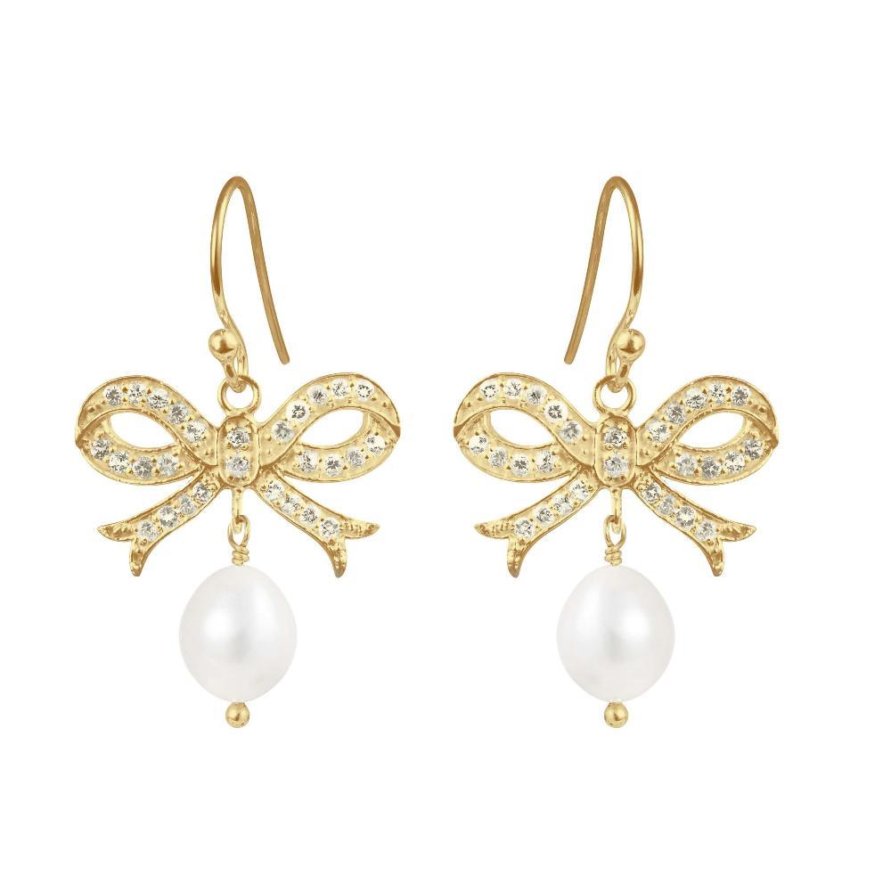 Diese eleganten Ohrringe von Susanne Friis Bjørner vereinen klassischen Charme mit einem luxuriösen Touch. Die Ohrringe bestehen aus vergoldetem 925er Sterlingsilber und sind mit einer detaillierten Schleife verziert, umgeben von funkelnden Zirkonia. Eine wunderschöne weiße Süßwasserperle hängt an der Schleife und rundet das raffinierte Design ab. Perfekt sowohl für den Alltag als auch für besondere Anlässe.