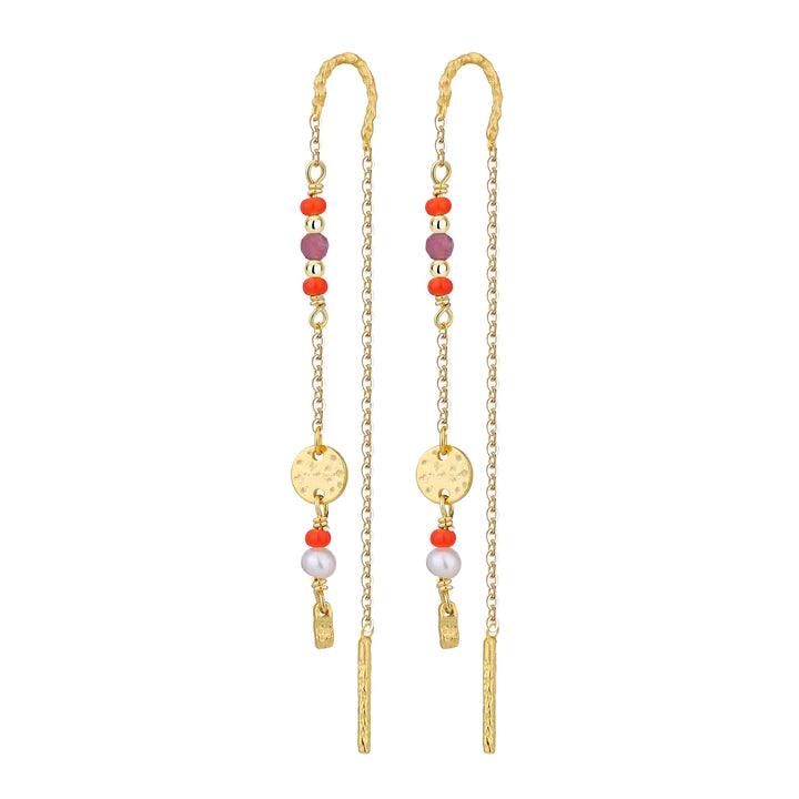 Die Saphira-Ohrringe aus vergoldetem Silber von Wioga ist ein wunderschöner Kettenohrring mit einer schönen Farbmischung aus Steinen, Perlen und Emaille.