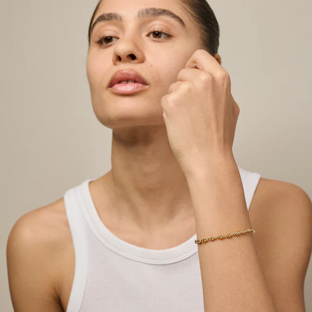 Norma Bead ist ein elegantes Armband, das aus kleinen polierten Kugeln in verschiedenen Größen besteht, die zusammen einen organischen und lebendigen Ausdruck erzeugen. Die feinen Variationen verleihen dem Schmuck einen raffinierten, femininen Look, der das Klassische mit dem Verspielten in Einklang bringt.