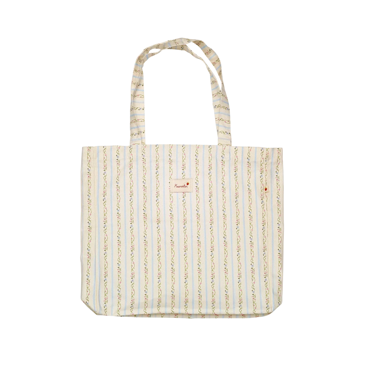 Gør hverdagens ærinder lidt smukkere med Maanesten Canvas Tote i Summer Stripes Blue. De friske striber og de nostalgiske blomster skaber et solrigt og legende udtryk, der føles let og ubesværet.