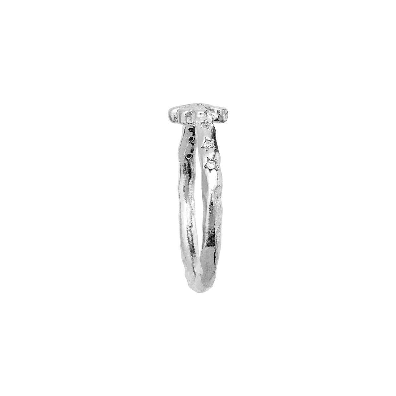 Den funklende hvide zirkonia tilfører et diskret glimt, der giver ringen et feminint og elegant udtryk. Perfekt at bære alene som et lille lykkesymbol eller sammen med andre ringe for et mere personligt look. En del af Maanesten SS26 kollektionen med fokus på symbolik og fine detaljer.