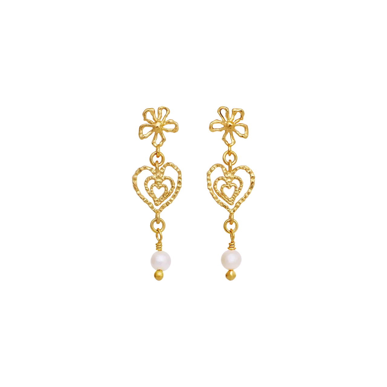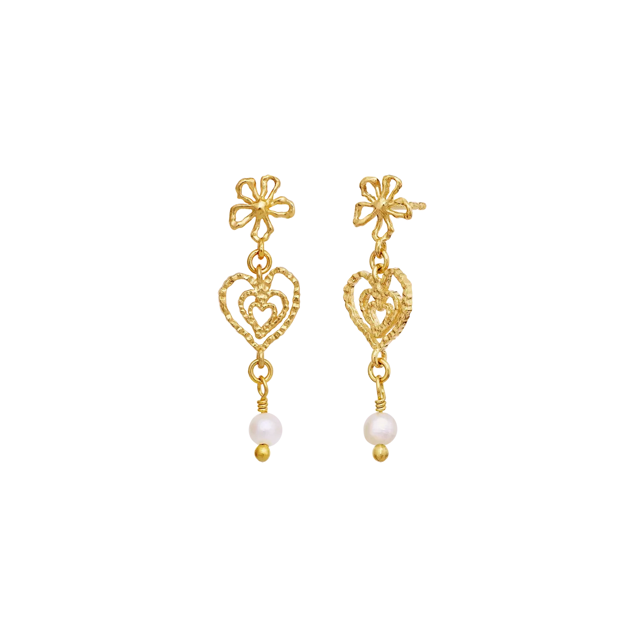 Den varme 18 kt. forgyldning giver øreringene en gylden glød, som fremhæver perlernes naturlige skær og gør dem lette at style til både hverdag og fest. En del af Maanesten SS26 kollektionen med fokus på sommerstemning og kærlige symboler.