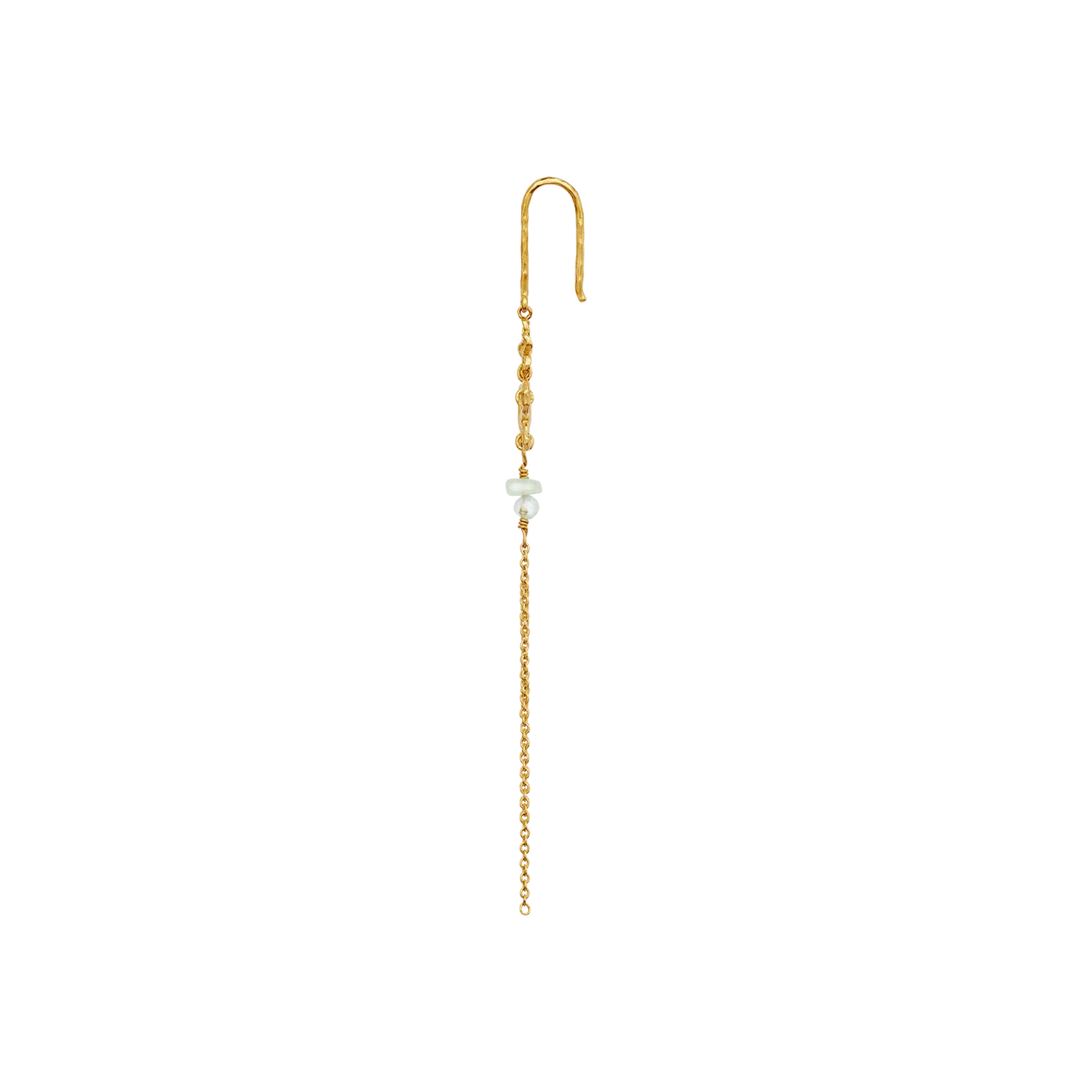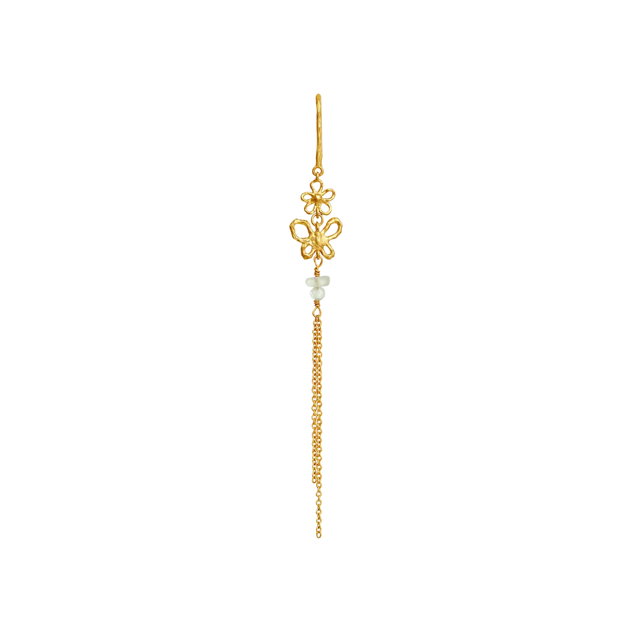 Maanesten Livia Single Kædeørering i forgyldt udgave udstråler sommerens lethed og ubekymrede glæde. Den lange, fine kæde falder elegant fra øret og bevæger sig smukt, mens den bløde prehnit tilfører et naturligt og drømmende skær.