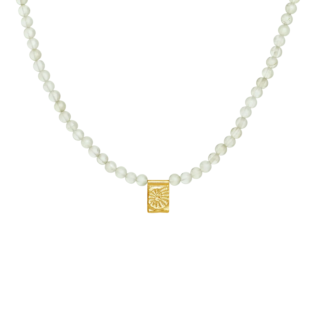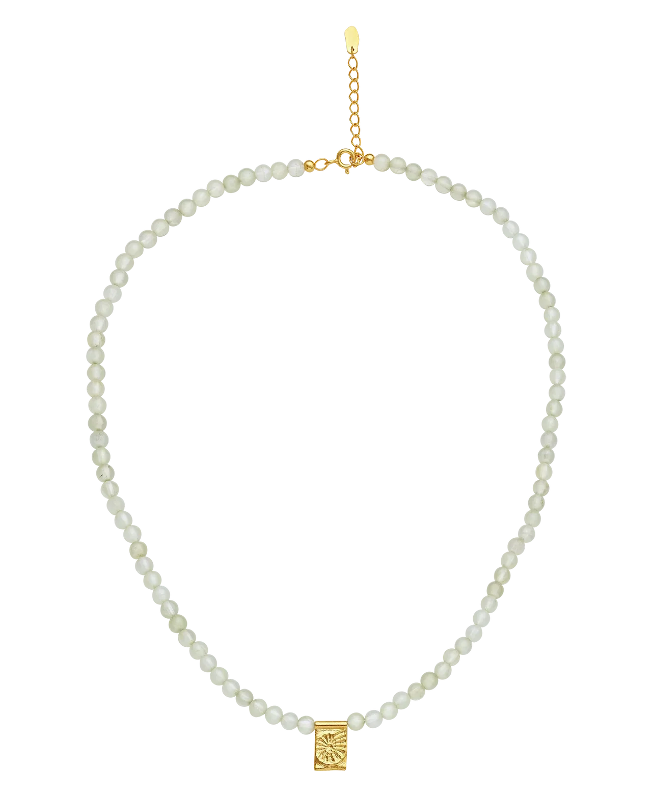 Den varme forgyldning kombineret med den bløde grønne prehnit giver halskæden et naturligt og levende udtryk. Den er smuk alene som et elegant statement og perfekt i kombination med andre kæder for et personligt lag-på-lag look. En del af Maanesten SS26 kollektionen med fokus på sommerens rytme og organiske former.