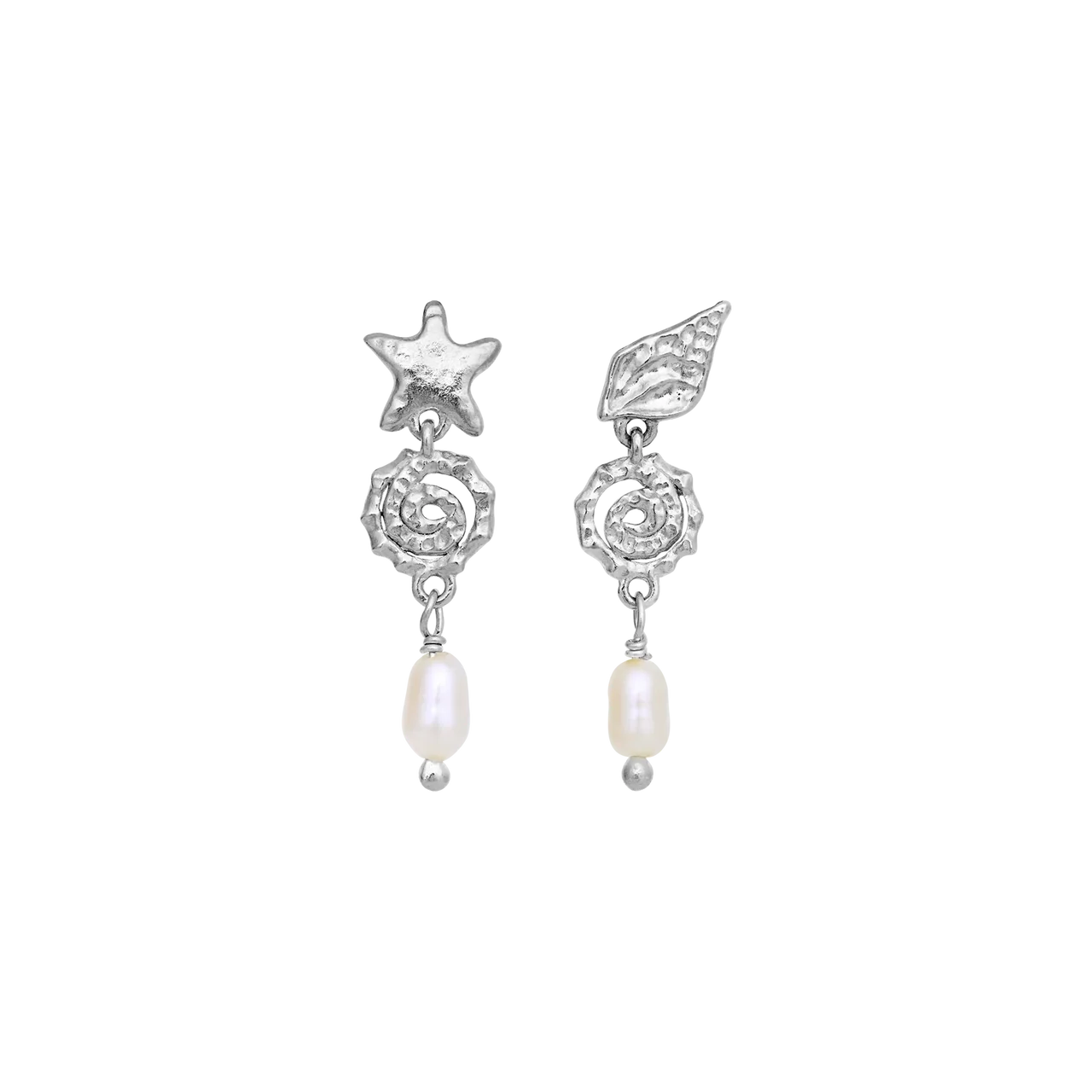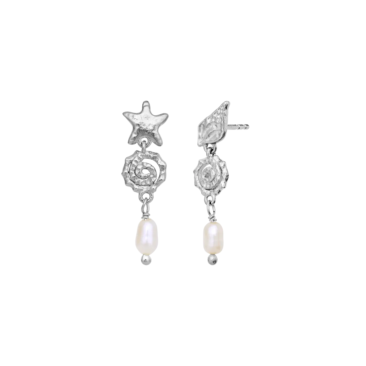 Nederst fuldendes designet af en elegant ferskvandsperle, der giver let bevægelse og et blødt, naturligt skær. Den kølige sølvfinish fremhæver strukturerne og skaber et mere underspillet, men stadig strålende udtryk. En del af Maanesten SS26 kollektionen med fokus på symbolik, lys og sommerlig lethed.
