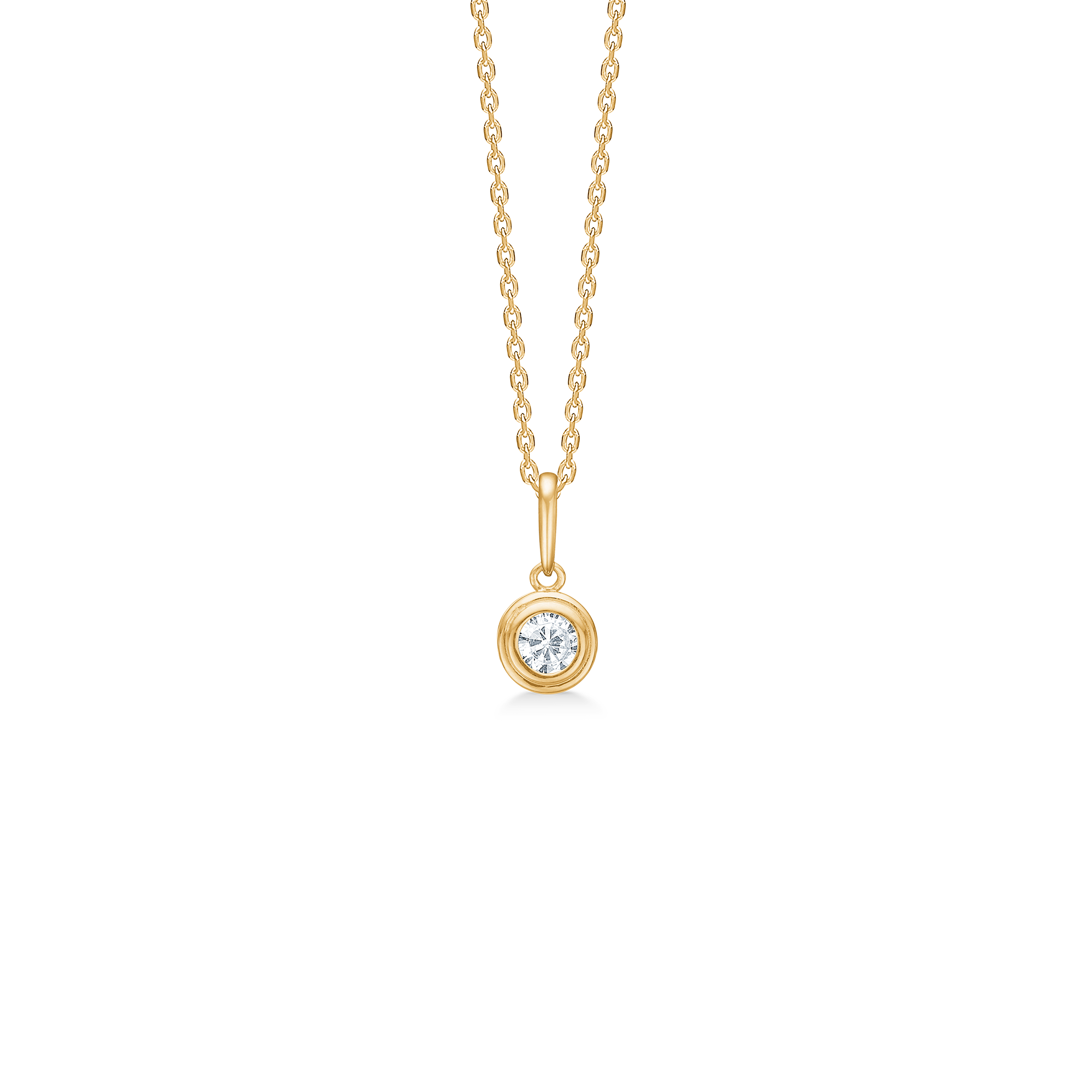 I centrum ligger en klar, rund facetslebet zirkonia, tæt omsluttet af en bezel-fatning. Den strukturerede krans omkring stenen skaber dybde og fremhæver det klare lys, mens den spejlblanke guldoverflade elegant reflekterer omgivelserne. Resultatet er et vedhæng med et præcist og fokuseret udtryk – feminint, raffineret og let at bære både til hverdag og særlige øjeblikke.