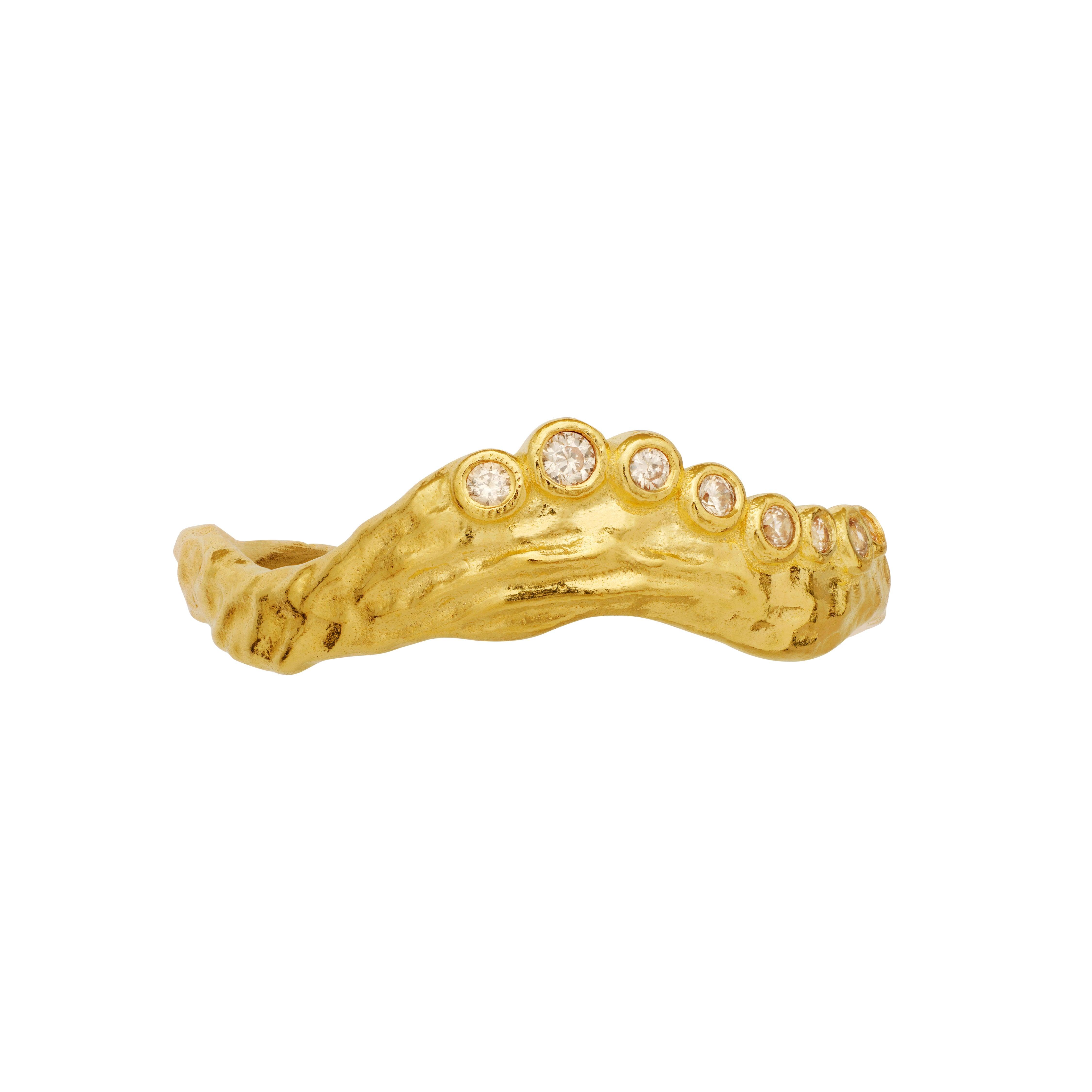 Der Mondstein-Selene-Ring kanalisiert mit seiner geschwungenen Kurve und der eleganten, mäandrierenden Oberfläche die weibliche Energie des Mondes. Die eingefassten Champagner-Zirkonia und weißen Zirkonia des Rings sorgen für Klarheit und Stärke und strahlen gleichzeitig eine überirdische Anmut aus. Dieser aus recyceltem Sterlingsilber (925) gefertigte und mit 18 Karat Gold plattierte Ring vereint zeitlose Eleganz mit moderner Schönheit und ist damit ein perfektes Symbol für Weiblichkeit und Kraft.