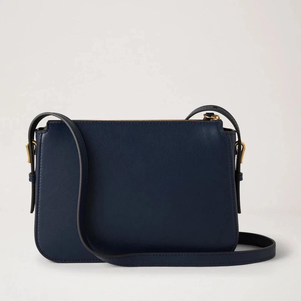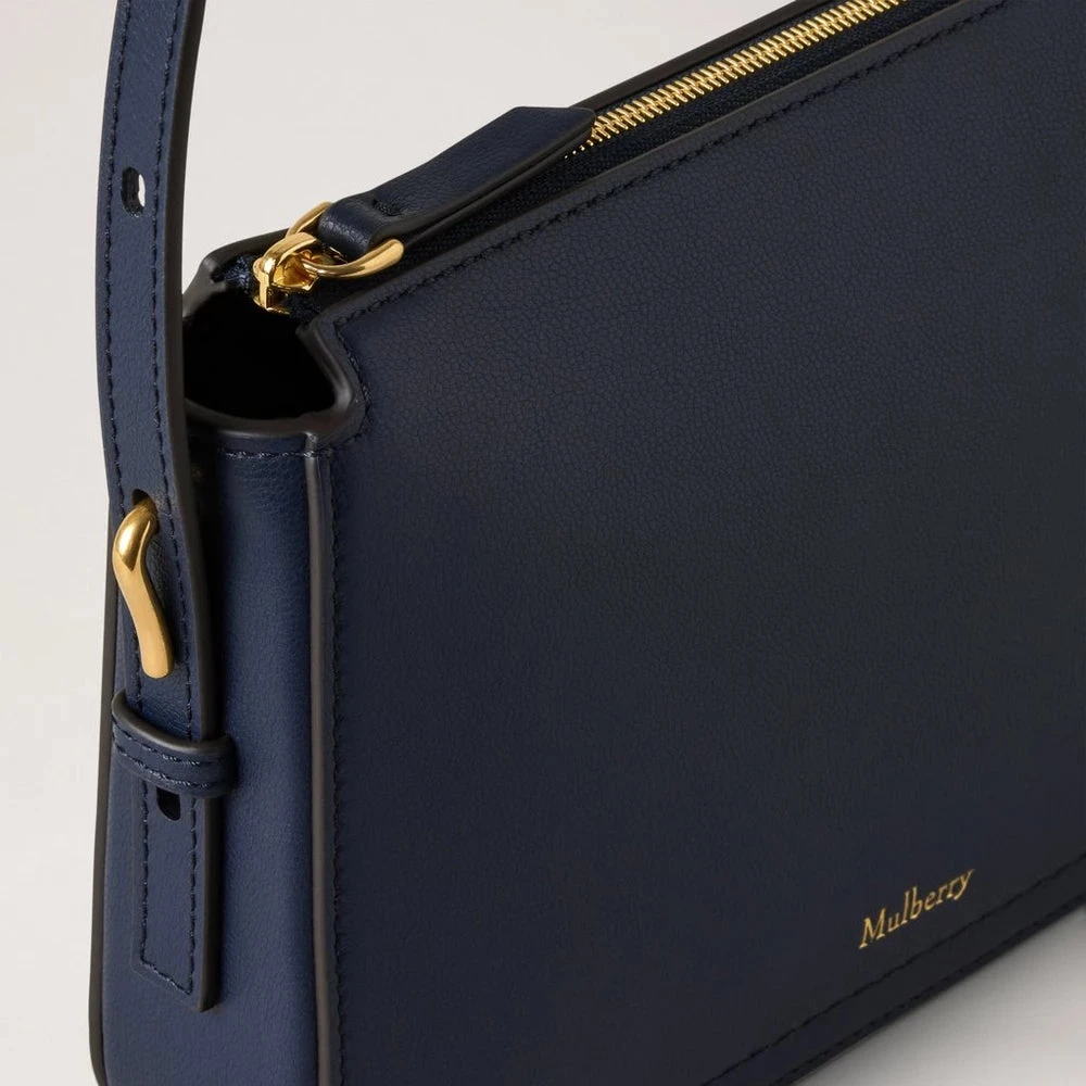 Die Tasche besteht aus exklusivem Micro Classic Grain-Leder in der Farbe Night Sky (Dunkelblau), das ihr einen hellen, eleganten und luxuriösen Look verleiht. Es verfügt über einen praktischen Reißverschluss, einen abnehmbaren und verstellbaren Schultergurt sowie feine zartgoldene Details, die das zeitlose Design unterstreichen. Das geprägte Mulberry-Logo auf der Vorderseite verleiht einen dezenten Hauch von Exklusivität.