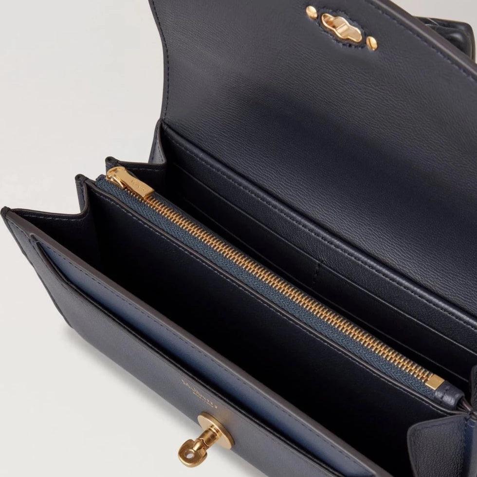 Diese Ikone Darley Das Portemonnaie mit Postbotenschloss in Goldbeschlägen verfügt über verschiedene gute Fächer und Taschen, die es zu einem zeitlosen Klassiker und dem perfekten Portemonnaie machen. Diese Edition ist aus dem edlen Micro Classic Grain-Leder gefertigt, das glatt ist Leder in der Farbe Night Sky, seien Sie also vorsichtig bei harten Oberflächen.