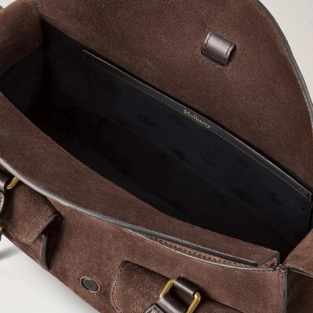 Die Tasche besteht aus luxuriösem schokoladenbraunem Wildleder, das ihr einen weichen und exklusiven Look verleiht. Durch den abnehmbaren und verstellbaren Riemen kann die Tasche sowohl über der Schulter als auch als Umhängetasche getragen werden, während die beiden Griffe dafür sorgen, dass sie leicht in der Hand zu halten ist. Die messingfarbenen Details und die blindgeprägte Mulberry-Signatur unterstreichen das handwerkliche Design und den klassischen britischen Stil.