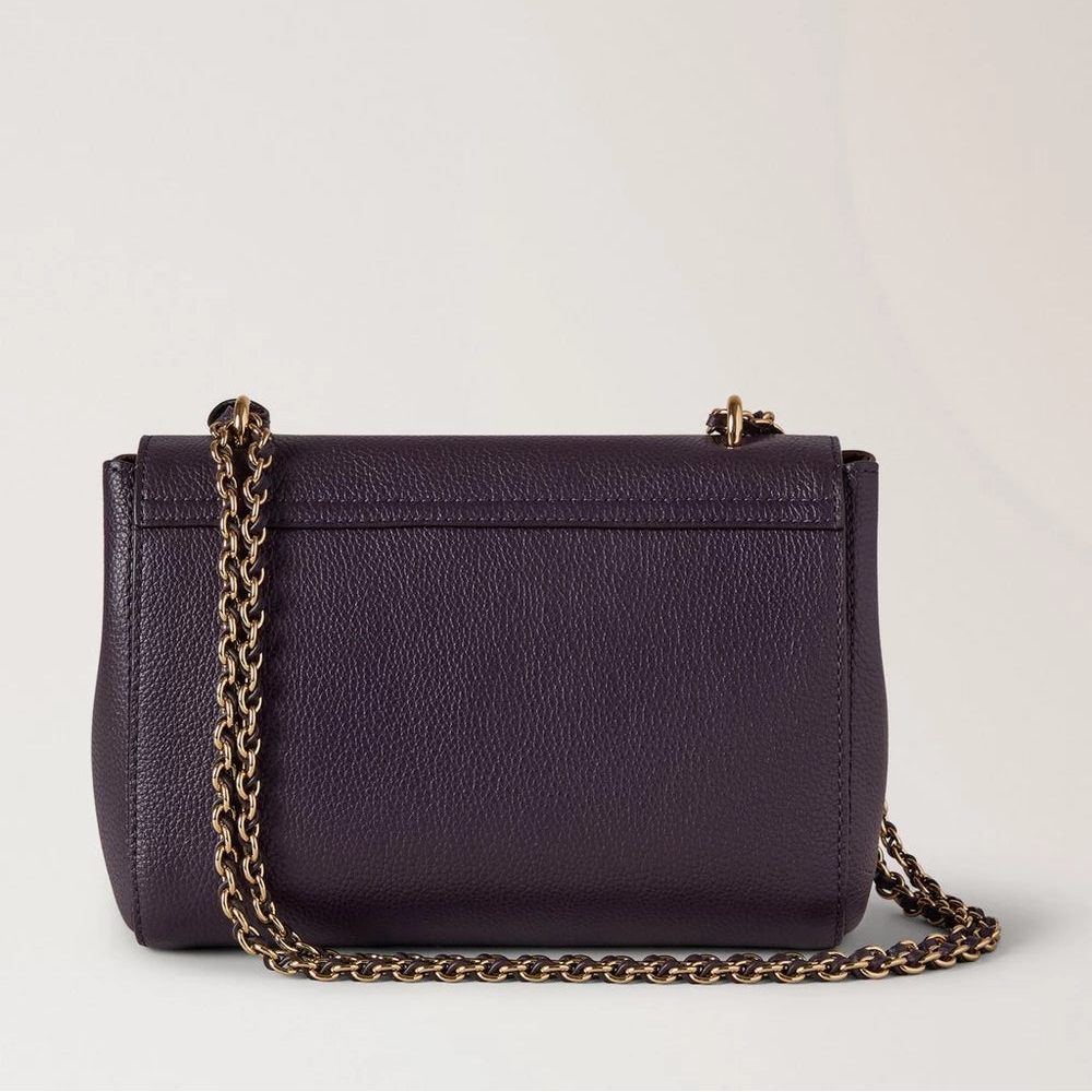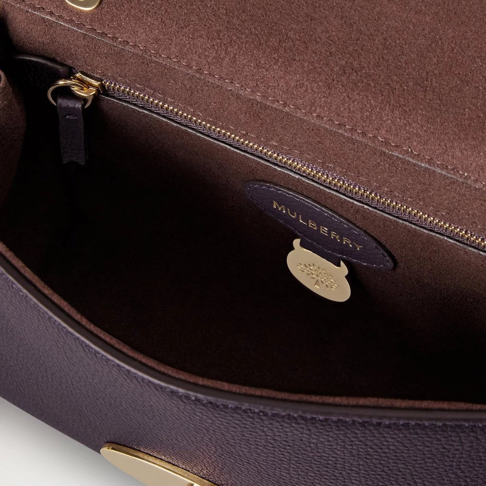 Tasken er udført i Deep Aubergine Small Classic Grain-læder, der har en blød overflade og en diskret struktur. De gyldne detaljer, Mulberrys ikoniske Postman’s Lock og den hængende læderfob med skjult hængelås giver tasken et eksklusivt og genkendeligt udtryk.